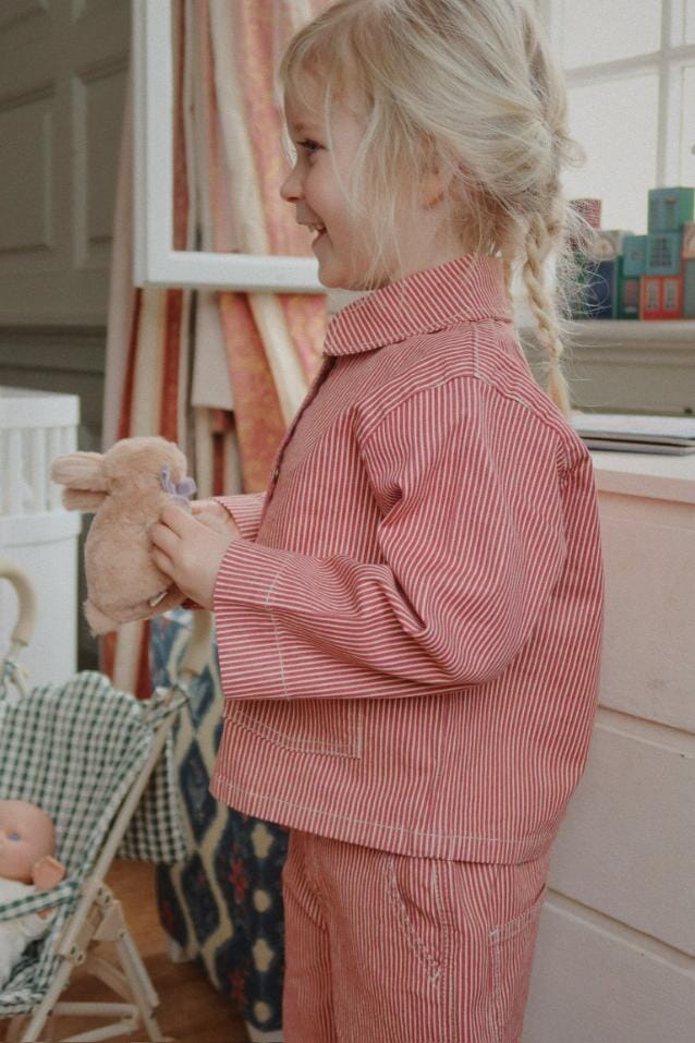Luc-Hose im Milk Rouge Stripe-Print von Konges Sløjd. Die Luc-Hose ist ein von Arbeitskleidung inspiriertes Stück mit vielen lustigen Details. Mit einem teilweise elastischen Bund, Vorder- und Gesäßtaschen und weiten Beinen für eine bequeme Passform.