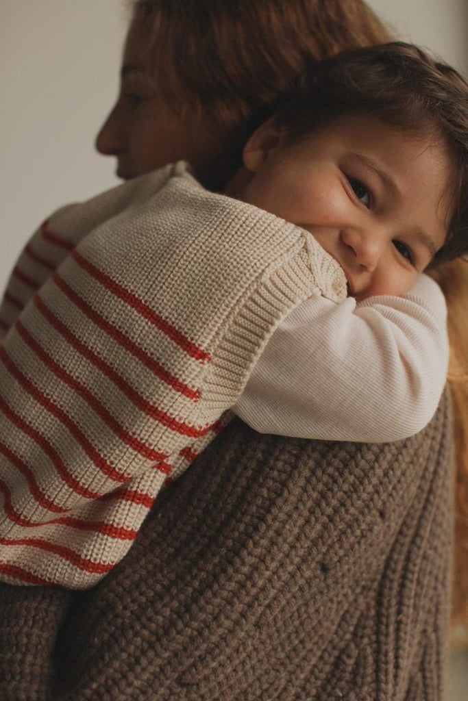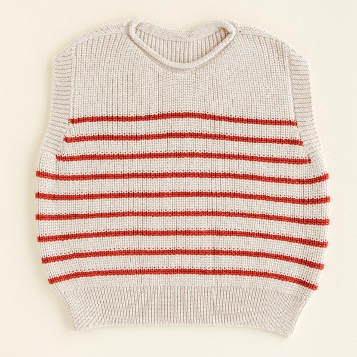 Harvey ärmelloser Pullover in Creme/Rot von Hvid. Dieser Pullover ist in einem Stück gestrickt und daher komplett nahtlos. Der dezente elastische Faden im Kragen macht ihn beim Anziehen dehnbar und sorgt für eine schöne Passform. Das Fischerrippenmuster verleiht dem Pullover eine wunderbar weiche Haptik. Dieser Style hat eine rundere Passform als die Babyversion und ein breiteres Rippenband am Saum, wodurch ein lockerer Look entsteht. Kombinieren Sie ihn einfach mit einer Bluse oder einem Hemd für ein verspieltes Outfit.