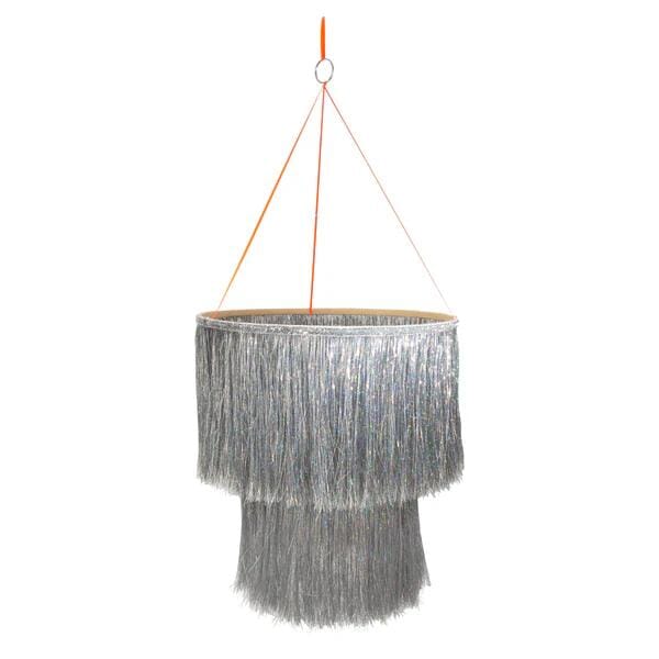 Kroonluchter in zilveren tinsel van Meri Meri. Deze prachtige kroonluchter geeft glans aan elk feest. Prachtig gemaakt van zilverkleurig klatergoud met fluwelen details en koord.