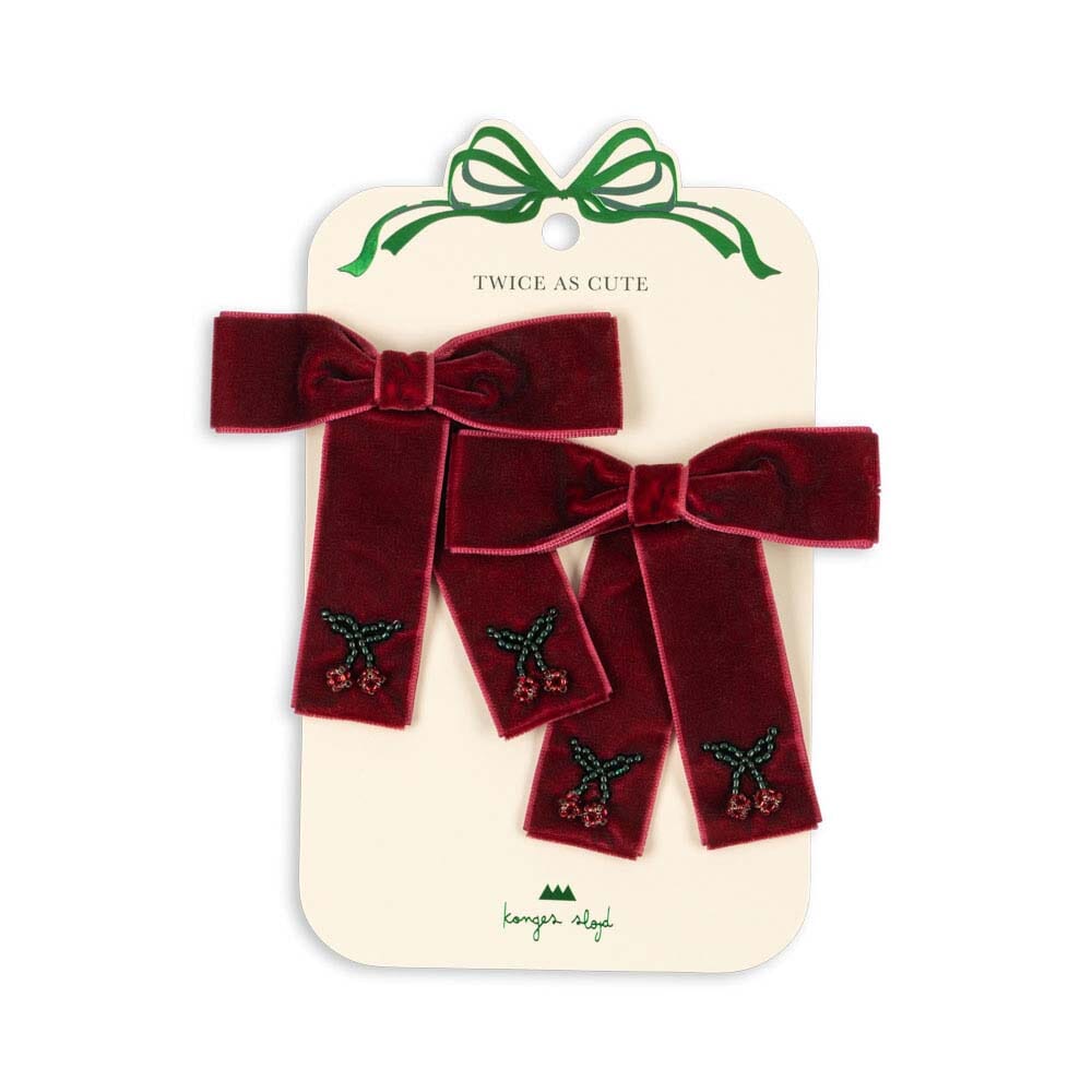 Strikvormige haarspeldjes in zacht fluweel van Konges Sløjd. Dankzij het clip-on systeem, voeg je makkelijk een feestelijke touch toe aan iedere outfit!