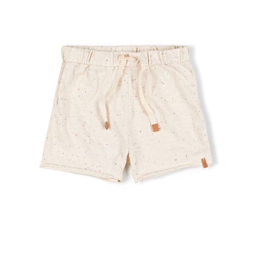 Basic Short in de kleur Ecru Speckle van Nixnut. Een fijne zomerbasic! Deze short heeft stoere, omgekeerde naden aan de zijkant en een fijne elastische taille die verstelbaar is met de koordjes. Het broekje is crèmekleurig met veelkleurige spikkels.