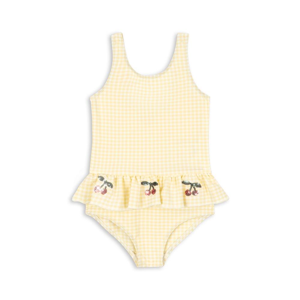 Etta badpak in de print Banana almond check van Konges Sløjd. Dit badpak is gemaakt van sneldrogende en flexibele seersuckerstof, die perfect is voor lange dagen op het strand of bij het zwembad. Afgewerkt met fransjes en kersjes in pailletten. Bij de maatjes 9-18 maanden zitten drukknoopjes in het kruis.