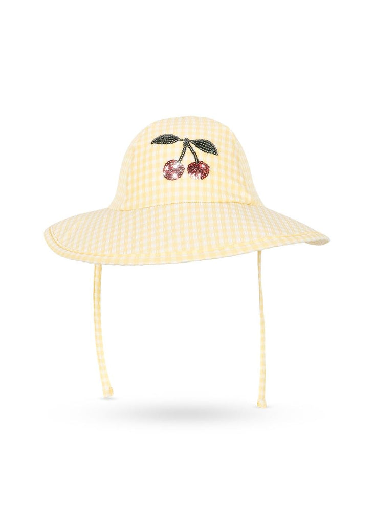 Etta hoedje in de print Banana almond check van Konges Sløjd. Dit hoedje is gemaakt van een seersuckerstof en biedt bescherming tegen de zon (SPF 50+). Het heeft een gewatteerde boord en twee koordjes om te strikken onder de kin.