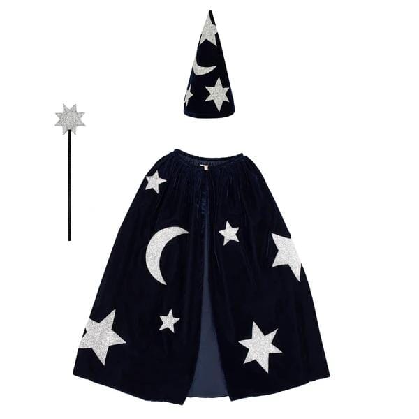 Fluwelen tovenaarskostuum in de kleur blauw van Meri Meri. De combinatie van luxe blauw fluweel met zilveren glittersterren en manen maakt dit kostuum heel speciaal. De toverstok is bedekt met een zilveren glitterstof ster, en heeft een blauw fluwelen lint om het houten handvat gewonden. Je hoeft alleen maar de cape om te slaan, de hoed op te zetten en met de toverstaf met sterren te zwaaien om er in een paar seconden als een tovenaar uit te zien. Het is perfect om te dragen naar feestjes of voor fantasierijk spel.