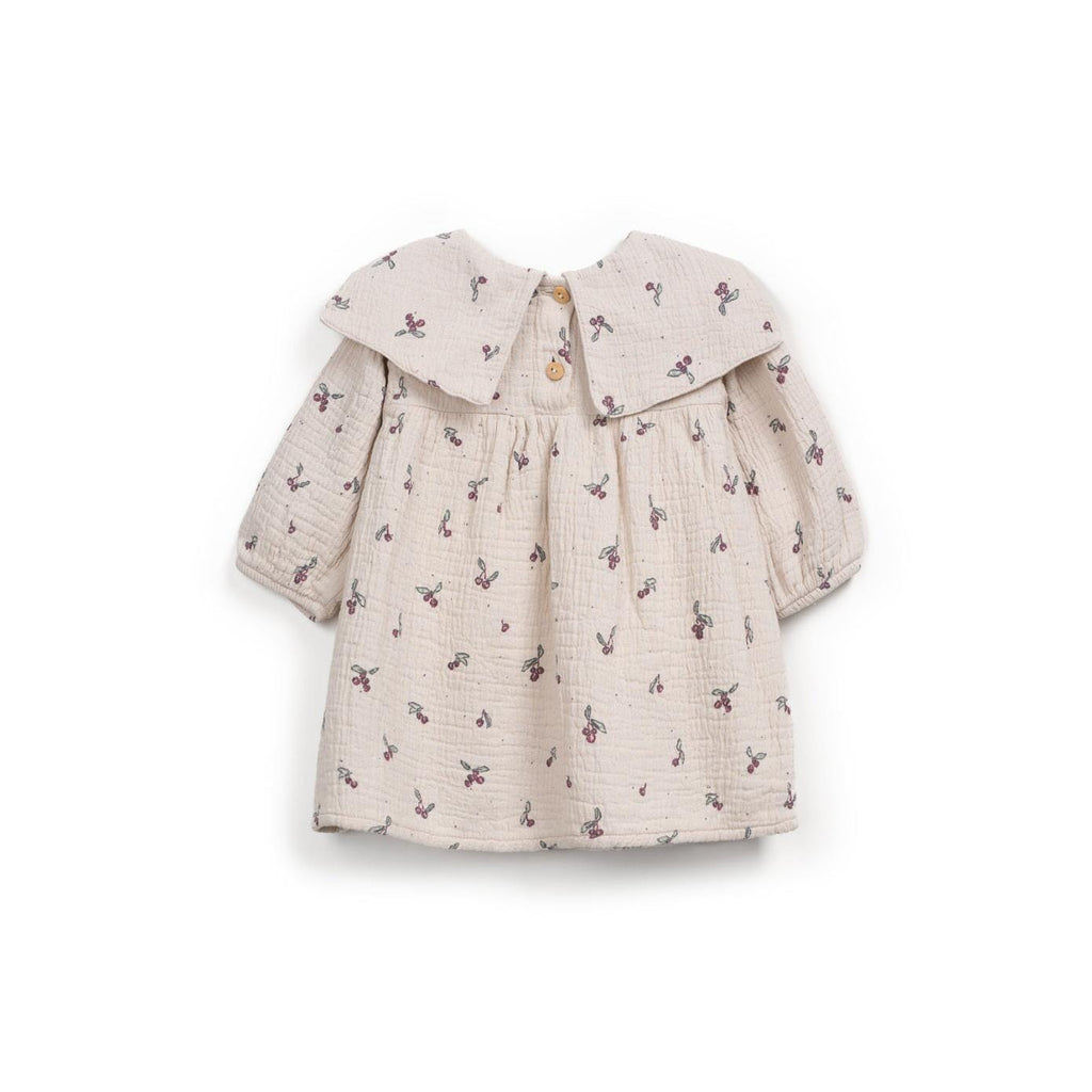 Geweven jurk in de kleur Tones van Play Up. Deze jurk heeft een grote kraag, een kokosnootknoop vooraan en een schattige bessenprint.
