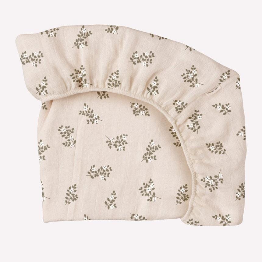 Hoeslaken voor een kindermatras formaat 60 x 120 cm in de print Holly flowers van Main Sauvage. Dit hoeslaken uit licht en ademend dubbel katoenmousseline omhult je mini 's nachts en tijdens dutjes met zachtheid. De elastische boord maakt het gemakkelijk om het hoeslaken op de matras te leggen.