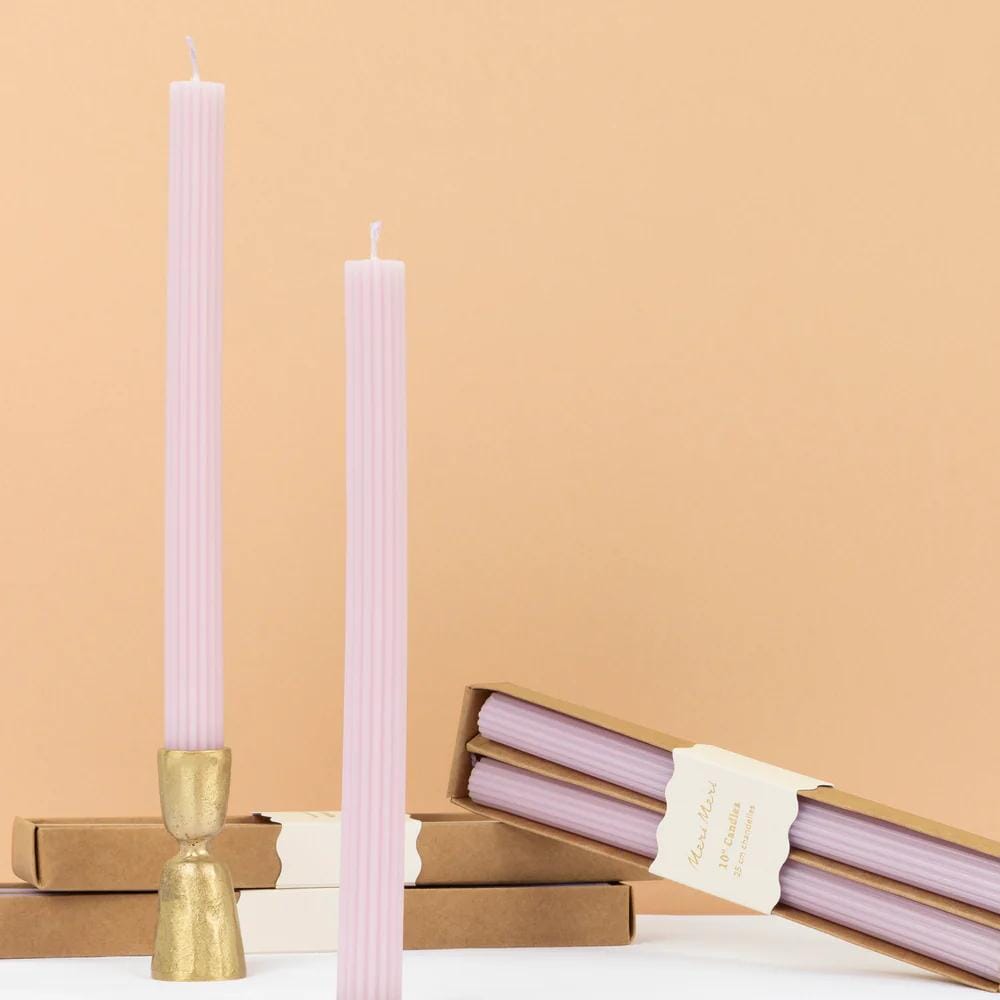 Set van 2 lange kaarsen in de kleur Dusty Lilac van Meri Meri. Deze geribbelde lila kaarsen hebben lonten in dezelfe kleur als de kaars. De kaarsen zijn verpakt in een kraftkartonnen doos, met een papieren band, zonder transparant venster.Gebruik ze om je feesttafel of gebruik ze als gezellige decoratie.