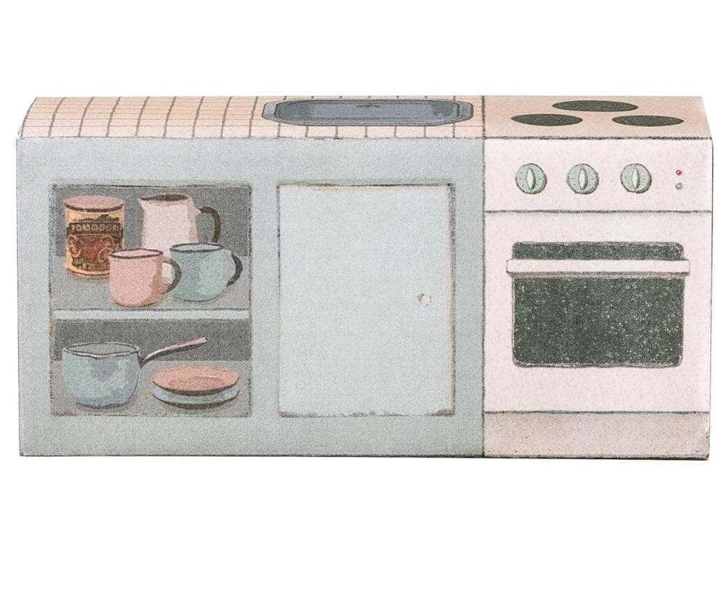 Keukenaanrecht voor muizen in de maat kleine zus / kleine broer van Maileg. Het kleine aanrechtje wordt geleverd met 2 kopjes en 2 borden, een pan, een kan en een klein blikje. De kleine gootsteen is gemaakt van metaal om er zo echt mogelijk uit te zien. Het past perfect in de keuken van het SuitCasa-muizenhuisje.