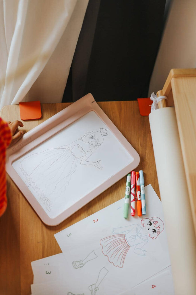 Kidydraw Pro Zeichentablett in Pink von Kidywolf. Mit KIDYDRAW PRO werden Kinder zu echten Stylisten. Dank eines ausgeklügelten Stickersystems können sie Silhouetten, Outfits, Accessoires und Motive endlos kombinieren – über 1.000 Kombinationen sind möglich, genau wie in einem echten Modestudio. Das doppelseitige Leuchtboard bietet Raum für freien, spielerischen und kreativen Ausdruck. Eine wertvolle Beschäftigung, um ihren Stil zu entwickeln, ihre Fantasie anzuregen und sich abseits von Bildschirmen zu unterhalten.