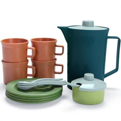 Dantoy Kaffeeset. Dieses 17-teilige Spielzeug-Kaffeeset ist ein robustes und umweltfreundliches Set aus Dantoys BIO-Toys-Kollektion. Es besteht zu 100 % aus recycelbarem Biokunststoff, der nachhaltig aus Zuckerrohr gewonnen wird.