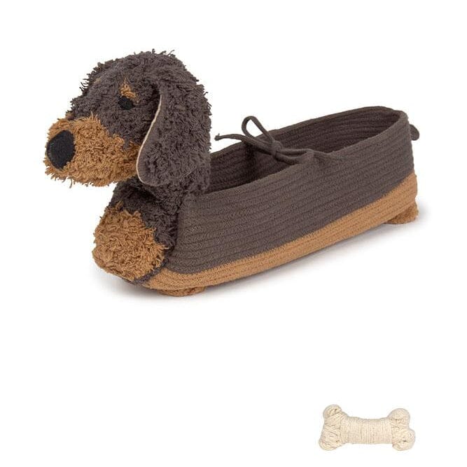 Opbergmand Sparky van Lorena Canals. Maak kennis met Sparky! De knuffelige opbergmaatje. Deze rechthoekige mand in de vorm van een teckel is handgemaakt van gevlochten koord van gerecyclede PET-flessenvezels, gemengd met ons donkergrijze katoen. Hij heeft een katoenen kop met een geborduurde snuit en handgeknoopte ogen, terwijl vier pompons de iconische korte pootjes en staart van de hond voorstellen. Hij heeft een koord dat de zijkanten met elkaar verbindt om zijn vorm te behouden, en een klein speelgoedbotje dat aan het label is bevestigd.