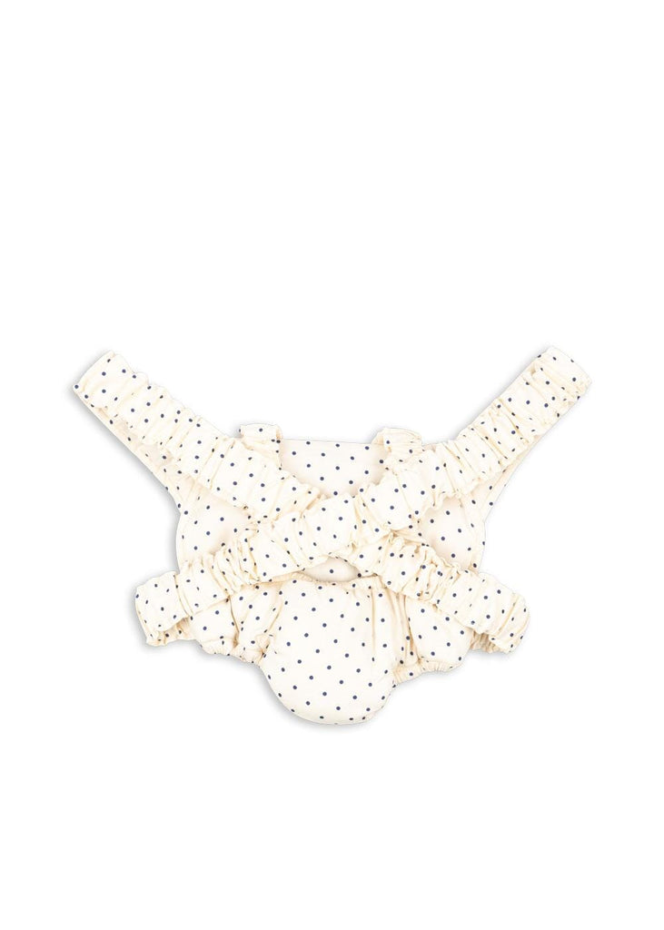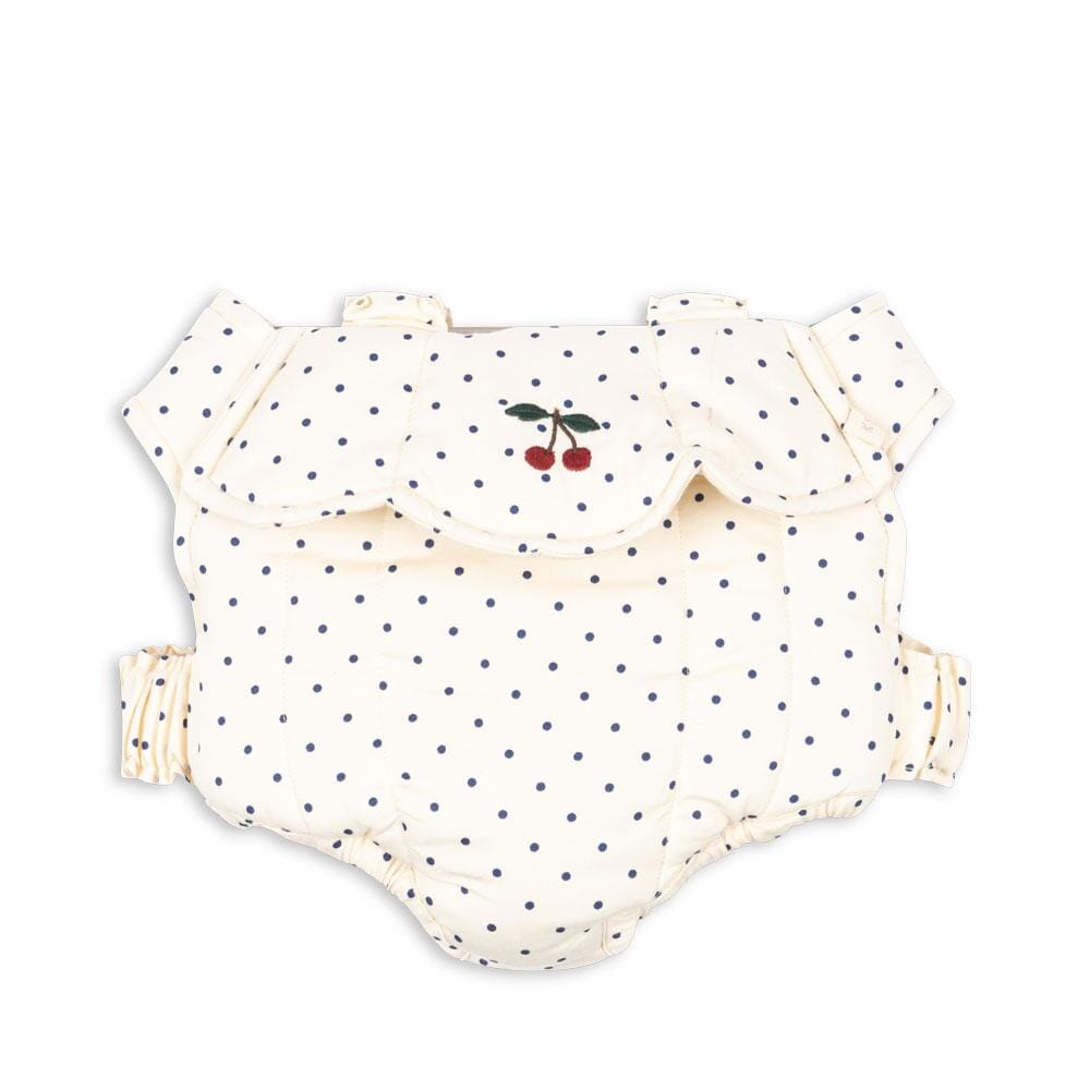 Poppendrager in de print Estate Dot van Konges Sløjd. Deze draagzak is gemaakt van katoen en ontworpen met elastische banden en schulprandjes. De drager is makkelijk in gebruik, comfortabel en licht van gewicht.