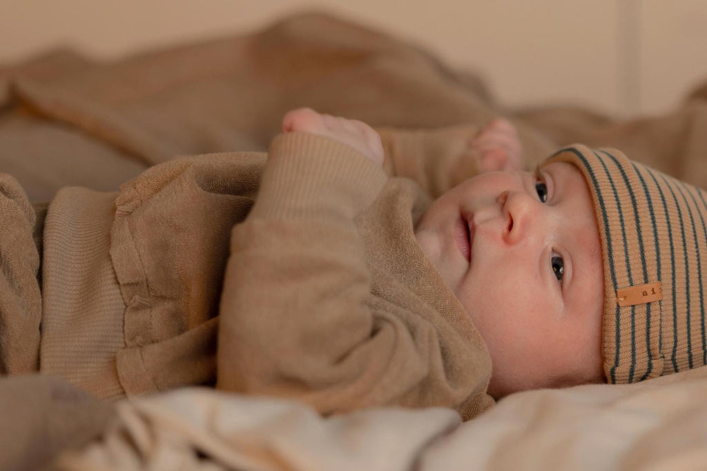 Tof Hat in de kleur Moss Stripe van Nixnut. Dit unisex mutsje is gemaakt van superzacht GOTS-gecertificeerd ribkatoen met elastaan ​​voor extra comfort rond het hoofdje. Het mutsje heeft een groen streepje in de kleur ‘Moss’. Het leren Nixnut labeltje is aan het mustje bevestigd. Nog leuker in combinatie met de bijpassende Tof Onesie.