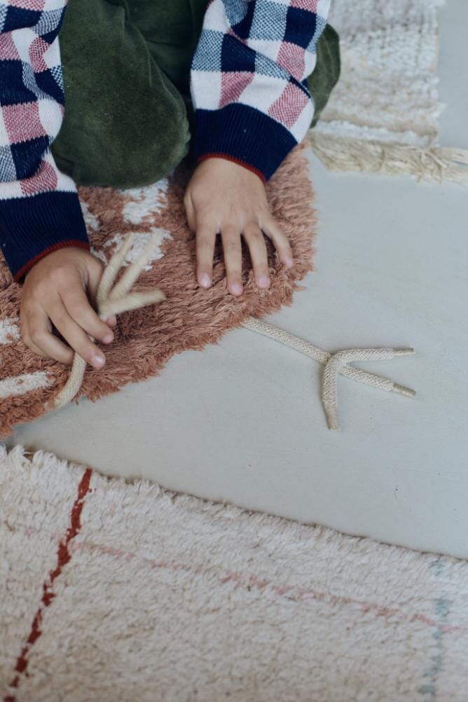 Wasbaar tapijt Chicken van Lorena Canals. Kakel, kakel! Dit handgemaakte katoenen vloerkleed in de vorm van een kip heeft een terracotta achtergrond met charmante details die de veren tot leven brengen. De beweegbare koordpootjes geven het kleed een speelse uitstraling, waardoor het een vrolijke aanvulling is op elke kamer. Dit wasbare kleed is perfect voor kinderkamers of speelkamers en is een eenvoudige manier om een kleurrijk accent toe te voegen. Combineer het met andere kleden uit de collectie om een boerderij-geïnspireerde look te creëren die zowel praktisch als leuk is.
